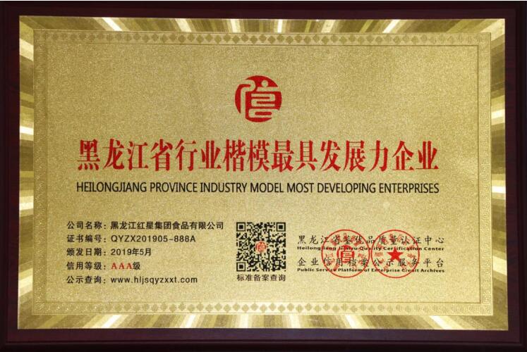由黑龍江省鑒優品質量認證中心、企業信用檔案公示服務平臺依法具體操作運營開展的《黑龍江省“行業楷模——誠信企業”》信用評級工作,依據紅星集團信用記錄、經營狀況、債務風險、發展前景、結合社會口碑、公眾認可度,經層層審核評估入選,于2019年5月,黑龍江紅星集團食品有限公司以AAA級企業信用等級,榮獲“黑龍江省行業楷模最具發展企業”殊榮。