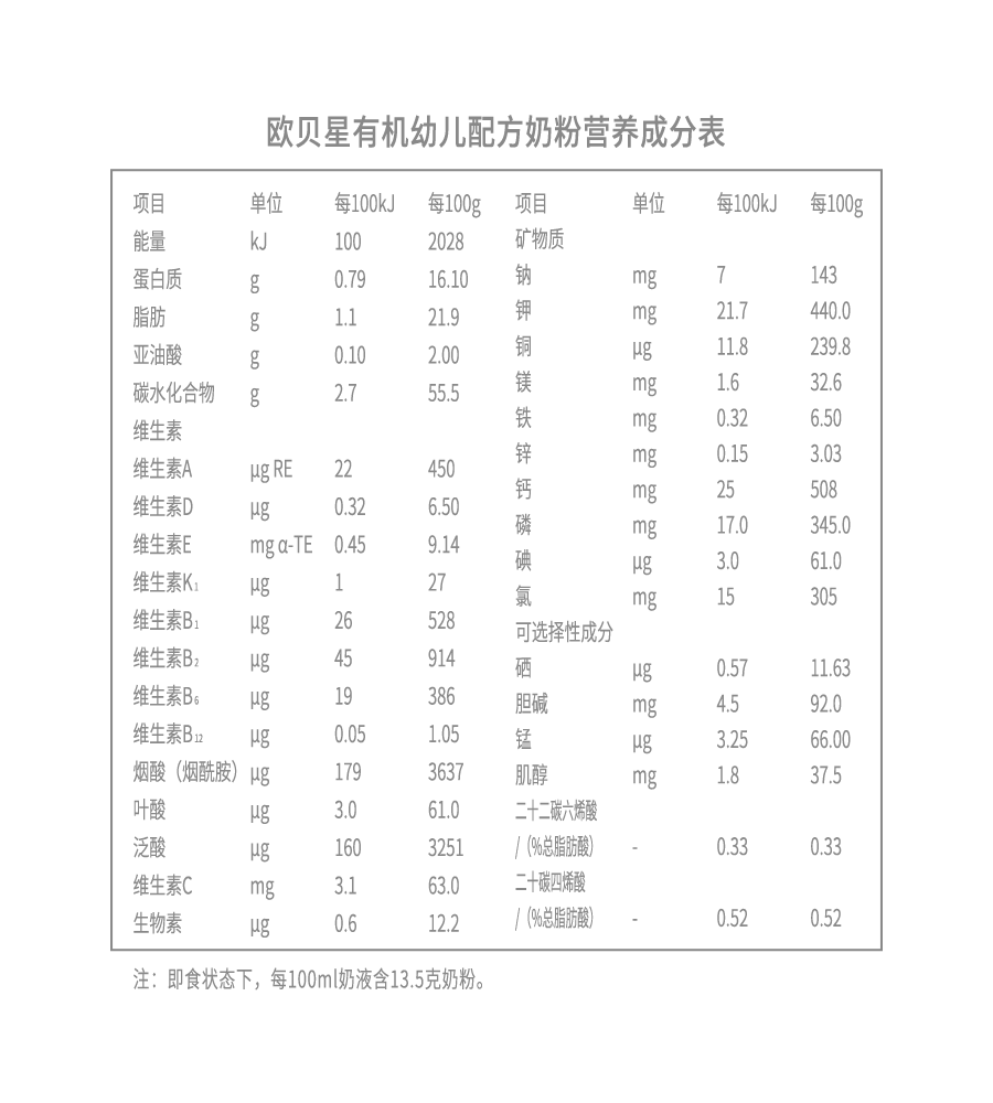 2017年8月歐貝星成為首批首個通過國家奶粉配方注冊的有機(jī)嬰幼兒配方奶粉,是通過歐盟有機(jī)認(rèn)證、中國有機(jī)產(chǎn)品認(rèn)證的雙標(biāo)產(chǎn)品、采用了有機(jī)生牛乳生產(chǎn),是真正的有機(jī)奶粉,更安全。